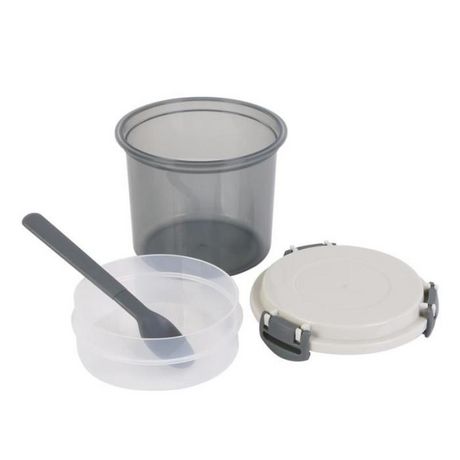 Informations Techniques : Dimensions : L. 11,5 x l. 11,5 x H. 10,8 cm Contenance : 60 cl Matière : Plastique Spécificités : Pratique & Design Boîte de Repas Avec Cuillère Double Compartiment Facile d'Utilisation Four à micro-ondes toléré Couleur : Gris