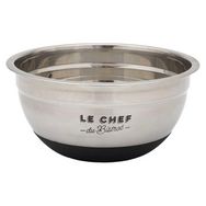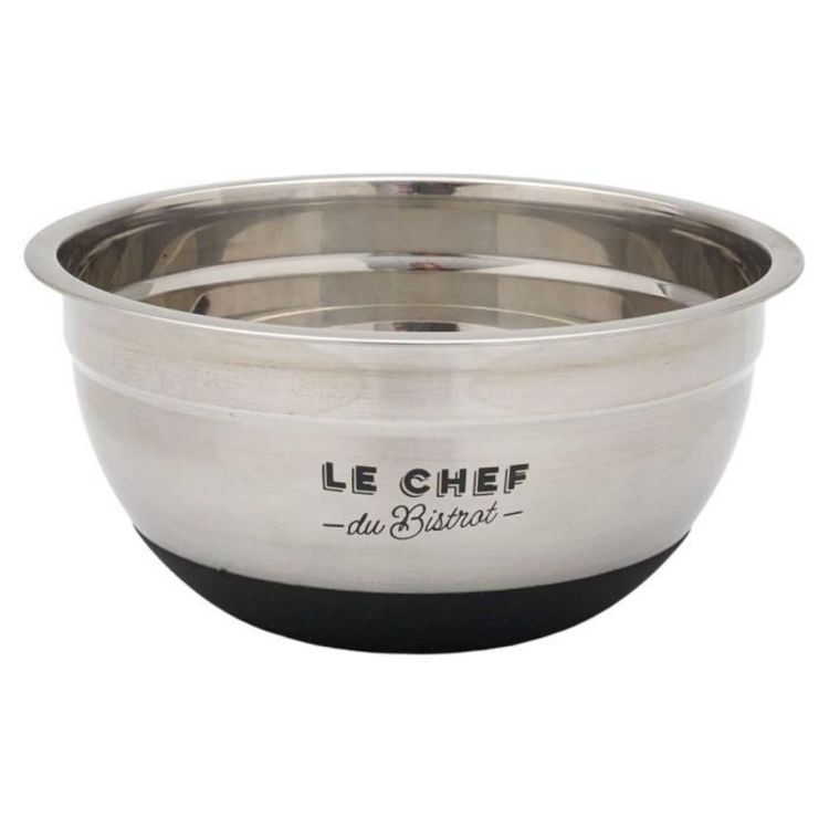 Informations Techniques : Dimensions : L. 20 x l. 20 x H. 9,5 cm Matières : Acier Inoxydable & Silicone Spécificités : Pratique & Robuste Bol mélangeur rond Antidérapant et stable Imprimé Le chef du Bistrot Compatibilité : Lave-vaisselle Poids : 0,18 kg Couleur : Argent