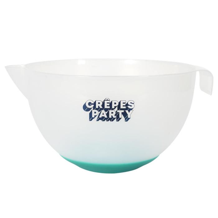 Informations Techniques : Dimensions : L. 28 x l. 13,7 x H. 23,2 cm Diamètre : D. 23,5 cm Matière : 100% Polypropylène Spécificités : Pratique & Utile Bol mélangeur antidérapant Avec poignée Inscription crêpes party Contenance : 3 L Poids : 0,19 kg Couleur : Transparent & Vert