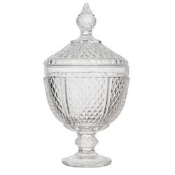 Informations Techniques : Dimensions : L. 15,2 x l. 15,2 x H. 31 cm Matière : 100% Verre Spécificités : Élégant & Utile Bonbonnière sur pied Design diamant Capacité : 110 cl Poids : 1,6 kg Couleur : Transparent