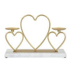 Informations Techniques : Dimensions : L. 30 x l. 9 x H. 20 cm Emplacements bougies : D. 7 cm Matières : Métal & Marbre Spécificités : Déco & Chic Bougeoir design cœurs Avec 2 emplacements Pour bougies rondes Socle en marbre Poids : 1,7 kg Couleur : Or