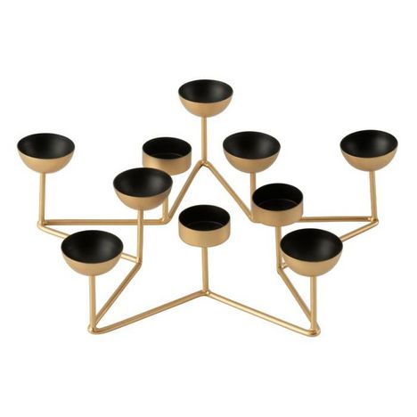 Informations Techniques : Dimensions : L. 35 x l. 35 x H. 8,5 cm Matière : 100% Métal Spécificités : Élégant & Déco Bougeoir design En forme d'étoile Peut accueillir 10 bougies chauffe-plats Bougies non incluses Poids : 0,46 kg Couleur : Noir & Or