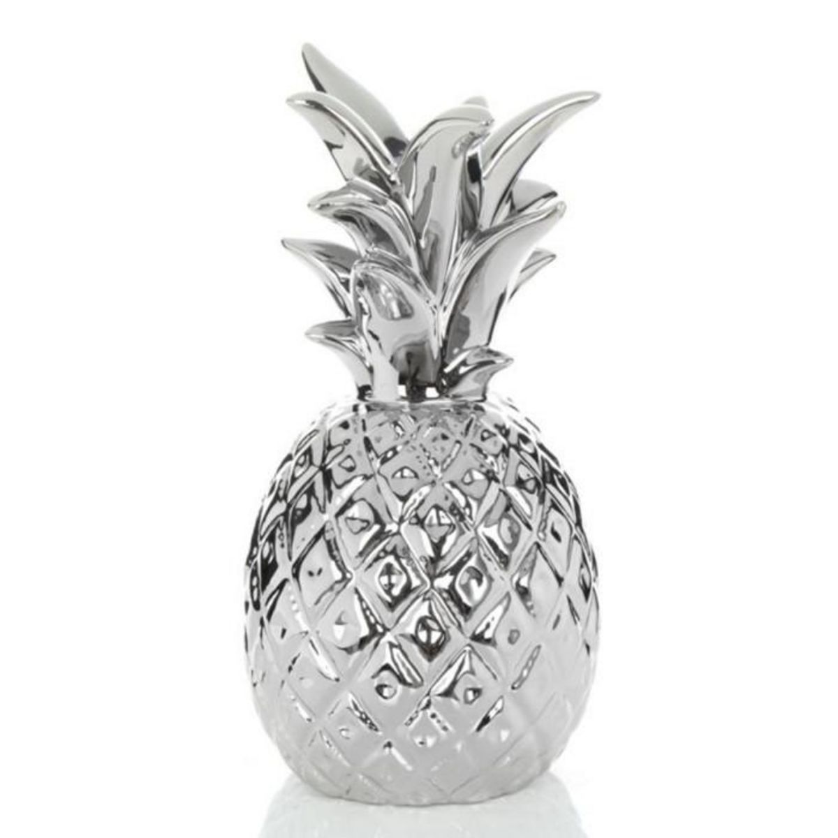Informations Techniques : Dimensions : L. 12,8 x l. 12,8 x H. 26,5 cm Matière : Faïence Spécificités : Luxe & Chic Bougeoir Design Forme Ananas Élément à Poser Fait Main Poids : 840 g Couleur : Argent