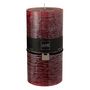 Informations Techniques : Dimensions : D. 10 x H. 20 cm Matière : Paraffine Spécificités : Tendance & Pratique Bougie déco Forme cylindrique Durée de combustion : 140 heures Poids : 1,32 kg Couleur : Cerise