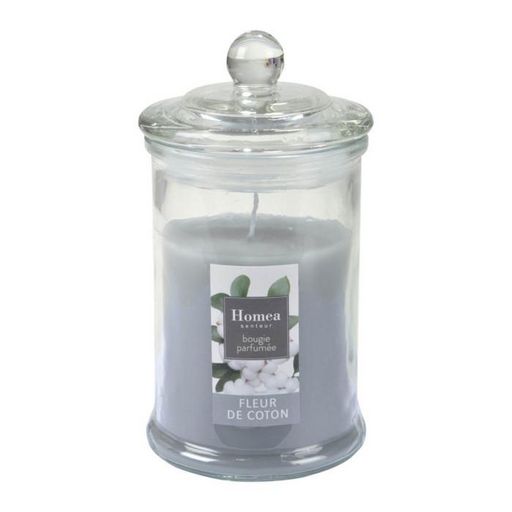 Informations Techniques : Dimensions : D. 7,8 x H. 15 cm Matière : Paraffine Spécificités : Déco & Pratique Bougie parfumée en bocal Avec couvercle Senteur : Fleur de coton Type de fragrance : Florale Forme ronde Poids : 0,24 kg Couleur : Gris