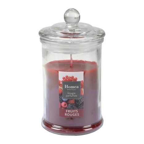 Informations Techniques : Dimensions : D. 7,8 x H. 15 cm Matière : Paraffine Spécificités : Déco & Pratique Bougie parfumée en bocal Avec couvercle Senteur : Fruits rouges Type de fragrance : Fruitée Forme ronde Poids : 0,24 kg Couleur : Rouge