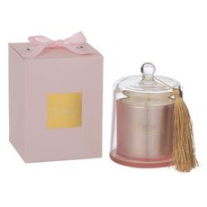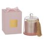Informations Techniques : Dimensions : L. 11 x l. 11 x H. 15,5 cm Matières : Paraffine, Cire & Verre Spécificités : Élégante & Tendance Bougie parfumée déco Avec cloche et pompon Inscription Bonheur Boite incluse Vendue à l'unité Senteur : Sapphire amber tea Type de fragrance : Florale Durée de c