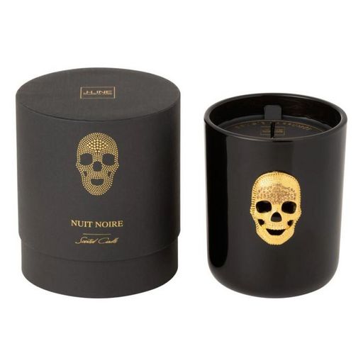 Informations Techniques : Dimensions : L. 11,5 x l. 11 x H. 13 cm Matières : Cire de Palme, Paraffine & Verre Spécificités : Déco & Originale Bougie parfumée design Avec boîte ronde Motif crâne doré en relief Vendue à l'unité Senteur : Mysterious Palace Type de fragrance : Orientale Durée de combus