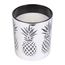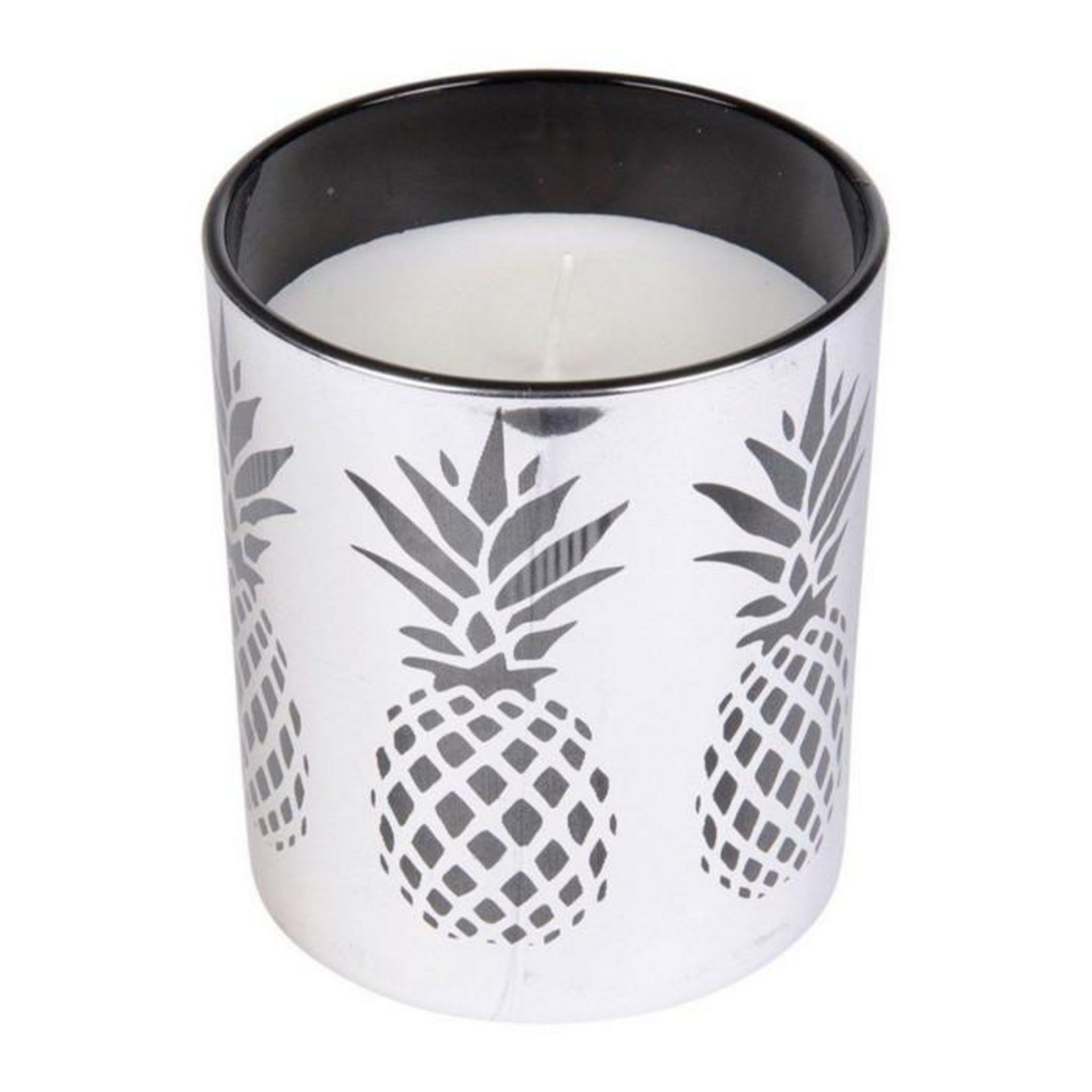 Informations Techniques : Dimensions : D. 9 x H. 10 cm Matières : Cire & Verre Spécificités : Pratique & Design Bougie Parfumée Verrine A Motifs Ananas Forme Ronde Senteur : Ambre Couleur : Argent