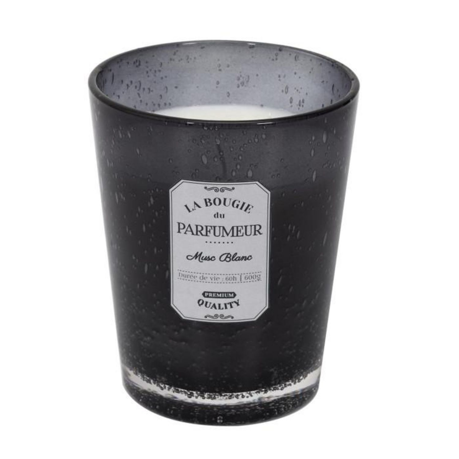 Informations Techniques : Dimensions : L. 13 x l. 13 x H. 16 cm Matière : Paraffine Spécificités : Moderne & Tendance Bougie Parfumée en Verre Forme Ronde Design Effet Bulle Senteur : Musc Blanc Durée de vie : 60 heures Contenance : 600 g Excellente Qualité Poids : 1,645 kg Couleur : Gris Foncé