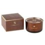 Informations Techniques : Dimensions : L. 13 x l. 13 x H. 8 cm Matières : Cire & Verre Spécificités : Tendance & Design Bougie Parfumée Déco Forme Ronde 3 Mèches Vendue à l'unité Durée de Combustion : 40 heures Senteur : Siberia Fir Type de Fragrance : Boisé Poids : 1,11 kg Couleur : Marron