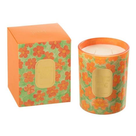 Informations Techniques : Dimensions : D. 10,5 x H. 13,5 cm Matière : Cire Spécificités : Déco & Utile Bougie parfumée Imprimé fleuri Senteur : Orange Flowers Type de fragrance : Florale Durée de combustion : 70 heures Poids : 1,08 kg Couleur : Orange & Vert