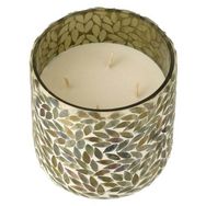 Informations Techniques : Dimensions : D. 14 x H. 15 cm Matières : Cire & Verre Spécificités : Déco & Utile Bougie parfumée 4 mèches Design mosaïque Motifs feuilles Avec boîte Vendue à l'unité Senteur : Tea & Herbscire Type de fragrance : Orientale Durée de combustion : 70 heures Poid
