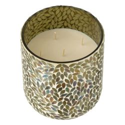Informations Techniques : Dimensions : D. 17 x H. 20 cm Matières : Cire & Verre Spécificités : Déco & Utile Bougie parfumée 5 mèches Design mosaïque Motifs feuilles Avec boîte Vendue à l'unité Senteur : Tea & Herbscire Type de fragrance : Orientale Durée de combustion : 120 heures Poi