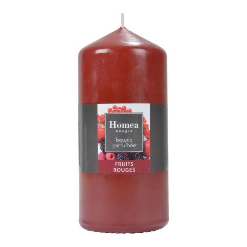 Informations Techniques : Dimensions : D. 7 x H. 15 cm Matière : Paraffine Spécificités : Tendance & Pratique Bougie pilier parfumée Senteur : Fruits rouges Type de fragrance : Fruitée Forme ronde Poids : 0,44 kg Couleur : Rouge