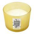 Informations Techniques : Dimensions : D. 11 x H. 8 cm Matière : Paraffine Spécificités : Déco & Pratique Bougie parfumée Avec 3 mèches Design verrine Senteur : Vanille Type de fragrance : Sucrée Forme ronde Poids : 0,24 kg Couleur : Jaune