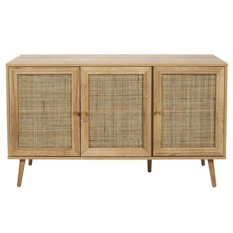 Informations Techniques : Dimensions : L. 115 x l. 39 x H. 70 cm Matières : Bois & Contreplaqué Spécificités : Pratique & Utile Buffet design 3 Portes 2 Étagères Poids : 28,5 kg Couleur : Naturel