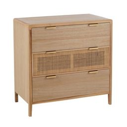 Informations Techniques : Dimensions : L. 90 x l. 50 x H. 90 cm Matières : Bois & Rotin Spécificités : Tendance & Pratique Buffet Design 3 Tiroirs Forme Rectangulaire Capacité de Charge Portante : 20 kg Poids : 20 kg Couleur : Naturel