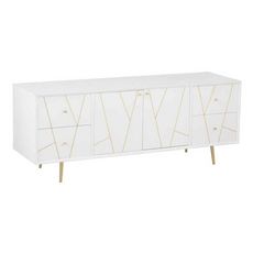 Informations Techniques : Dimensions : L. 150 x l. 45 x H. 59 cm Matières : Bois & Métal Spécificités : Pratique & Tendance Buffet Design 4 Tiroirs 2 Portes Forme Rectangulaire A monter soi-même Poids : 36 kg Couleur : Blanc & Or
