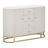 Informations Techniques : Dimensions : L. 120 x l. 40 x H. 85 cm Matières : Métal, Bois, Tissu & Polyuréthane Spécificités : Pratique & Chic Buffet ovale Plateau effet marbre Avec 4 tiroirs et 2 portes Recouvert de tissu Poignées style diamant Poids : 33,6 kg Couleur : Crème, Or & Blanc