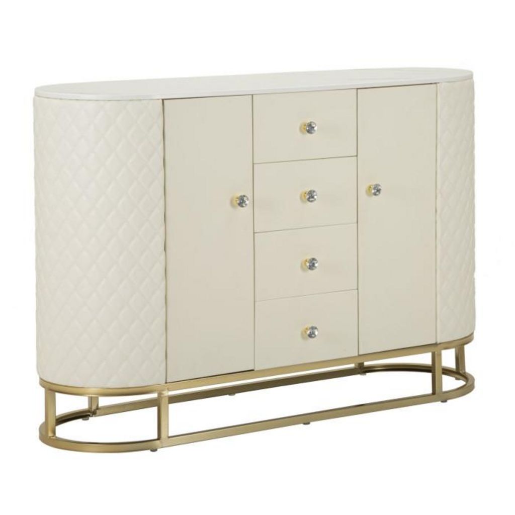 Informations Techniques : Dimensions : L. 120 x l. 40 x H. 85 cm Matières : Bois (Pin), MDF, Métal, Polyuréthane & Plastique Spécificités : Pratique & Tendance Buffet ovale design Plateau effet marbre Revêtement matelassé Avec 4 tiroirs et 2 portes Poignées style diamant Poids : 32 kg Couleur : B