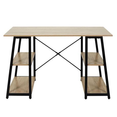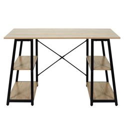 Informations Techniques : Dimensions : L. 120 x l. 50 x H. 73 cm Matières : Bois, Métal & Fer Spécificités : Pratique & Utile Bureau Design Style Tréteau 2 Étagères de chaque Côté Plateau en Bois Poids : 16,5 kg Couleur : Naturel & Noir