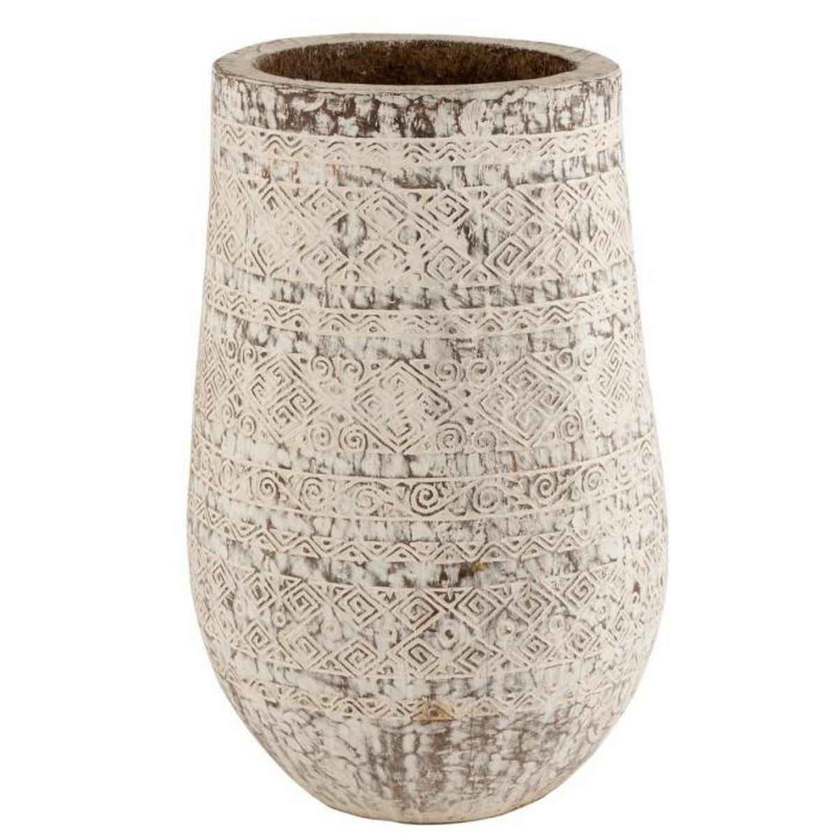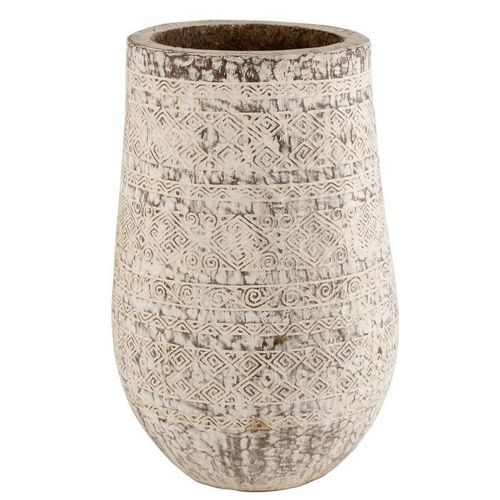 Informations Techniques : Dimensions : D. 65 x H. 100 cm Matière : Bois (Palmier) Spécificités : Tendance & Moderne Cache-Pot Design Forme Ronde Style Ethnique Couleur : Blanc