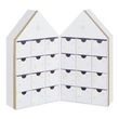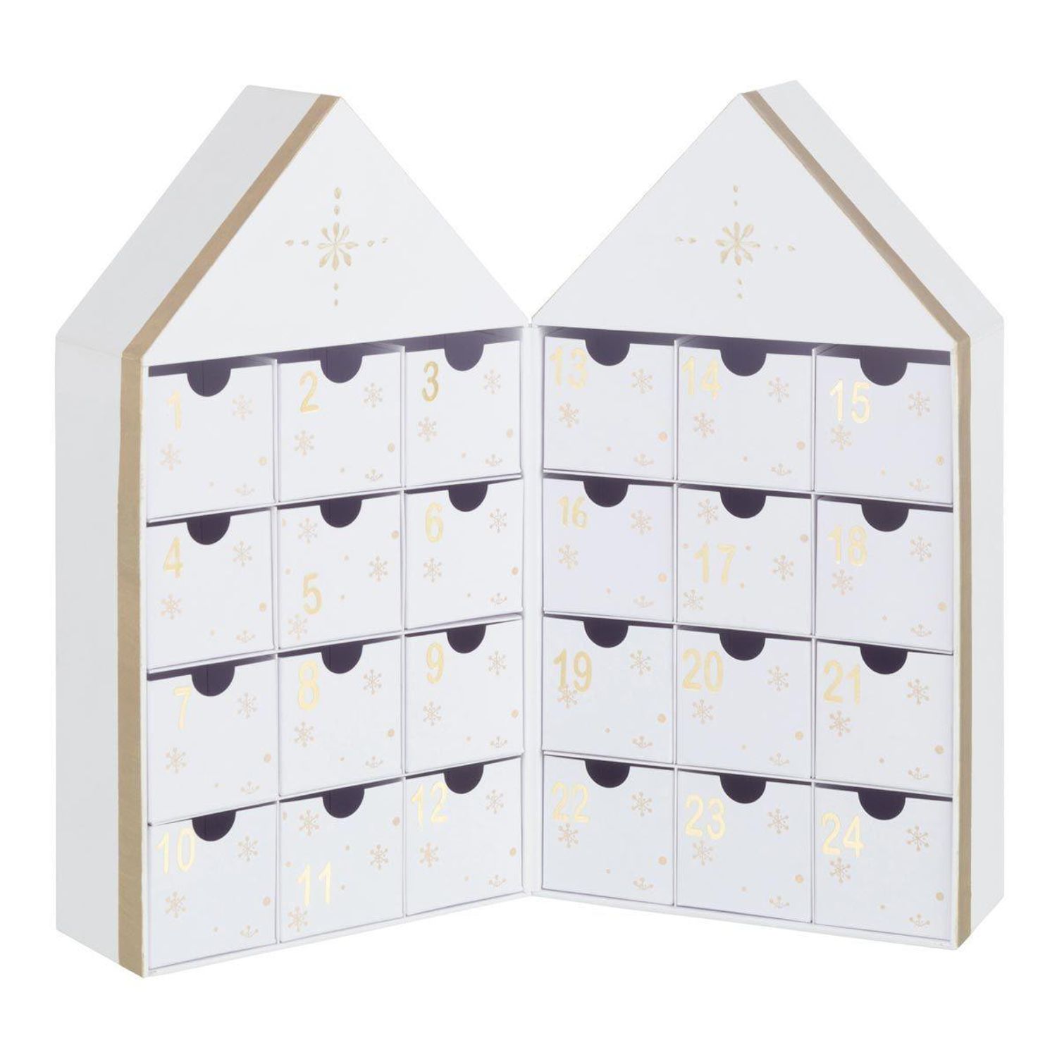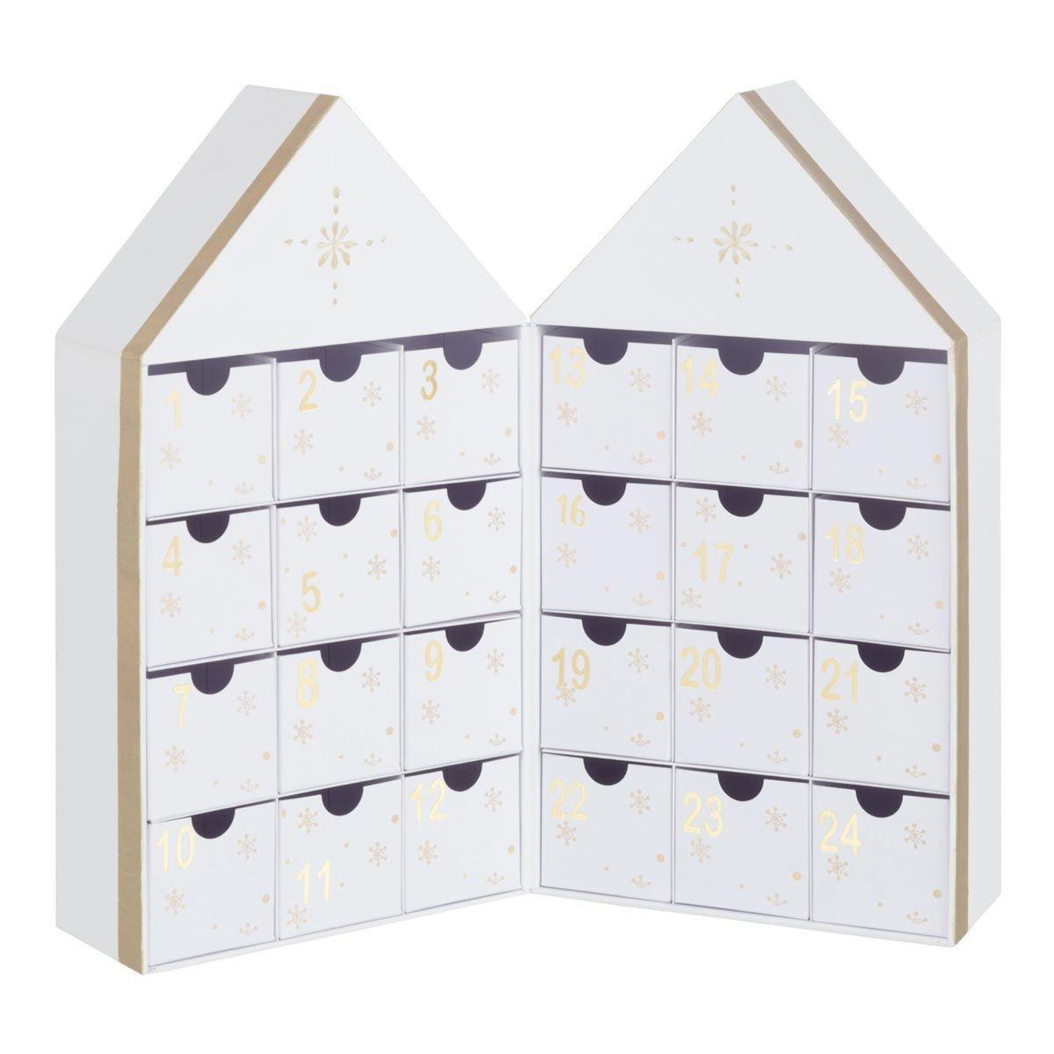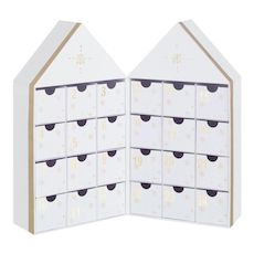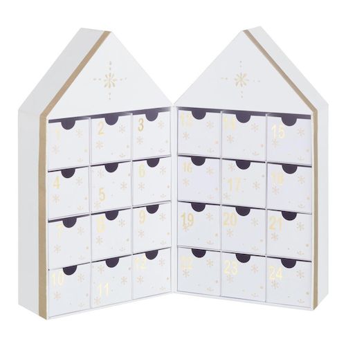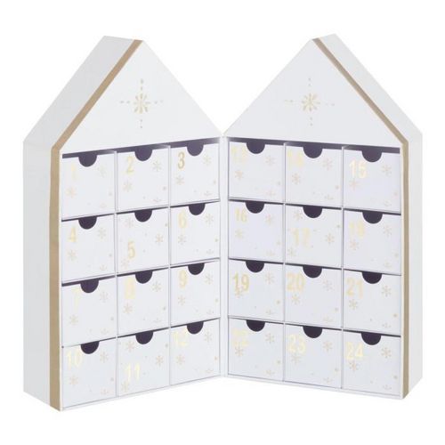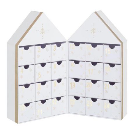 Informations Techniques : Dimensions : L. 31 x l. 7 x H. 34,5 cm Matière : 100% Carton Spécificités : Personnalisable & Déco Calendrier de l'avent En forme de maison Poids : 0,62 kg Couleur : Blanc & Or