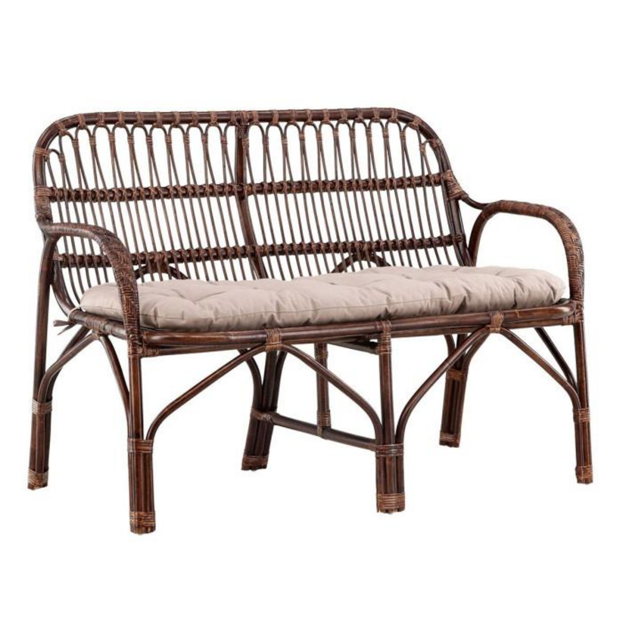 Informations Techniques : Dimensions : L. 129 x l. 62 x H. 93 cm Matière : Rotin Spécificités : Confortale & Élégant Canapé de jardin 2 places Coussin molleux inclus Poids max supporté : 100 kg Poids : 11,46 kg Couleur : Noyer Foncé