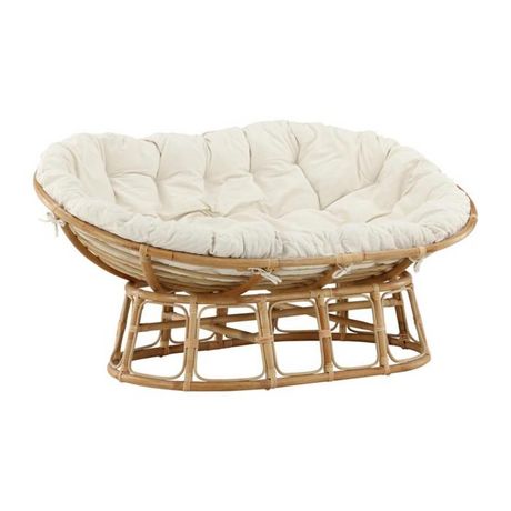 Informations Techniques : Dimensions : L. 165 x l. 108 x H. 97 cm Assise : L. 150 x l. 54 x H. 34 cm Accoudoirs : l. 4 cm Matières : Fauteuil : Rotin Coussin : Polyester Spécificités : Pratique & Original Canapé d'extérieur 2 places Assise confortable Coussin inclus Usage extérieur Style mamasan Po