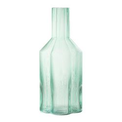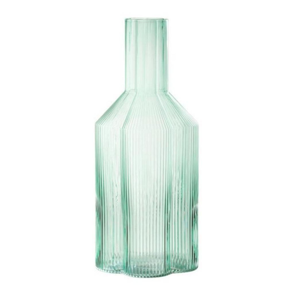 Informations Techniques : Dimensions : L. 11 x l. 11 x H. 27 cm Matière : Verre Spécificités : Pratique & Original Carafe design Motif rayures Forme pétales de fleur Contenance : 1,35 L Poids : 0,47 kg Couleur : Azur