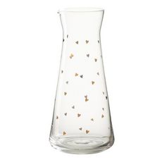 Informations Techniques : Dimensions : L. 11 x l. 11 x H. 23 cm Matière : 100% Verre Spécificités : Élégante & Utile Carafe design Imprimé cœur Compatible lave-vaisselle Capacité : 1 L Poids : 0,35 kg Couleur : Transparent & Or