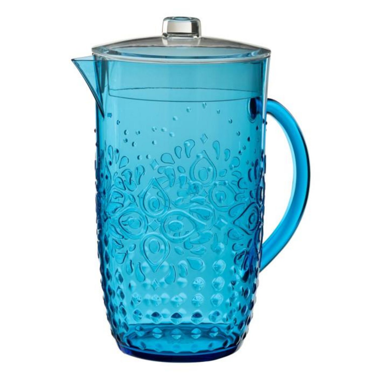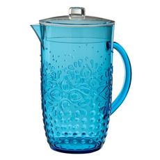 Informations Techniques : Dimensions : L. 20,7 x l. 20,7 x H. 23,4 cm Matière : 100% Plastique Spécificités : Colorée & Robuste Carafe avec couvercle Motifs en relief Compatible lave-vaisselle Vendue à l'unité Capacité : 2,5 L Poids : 0,48 kg Couleur : Bleu Azur