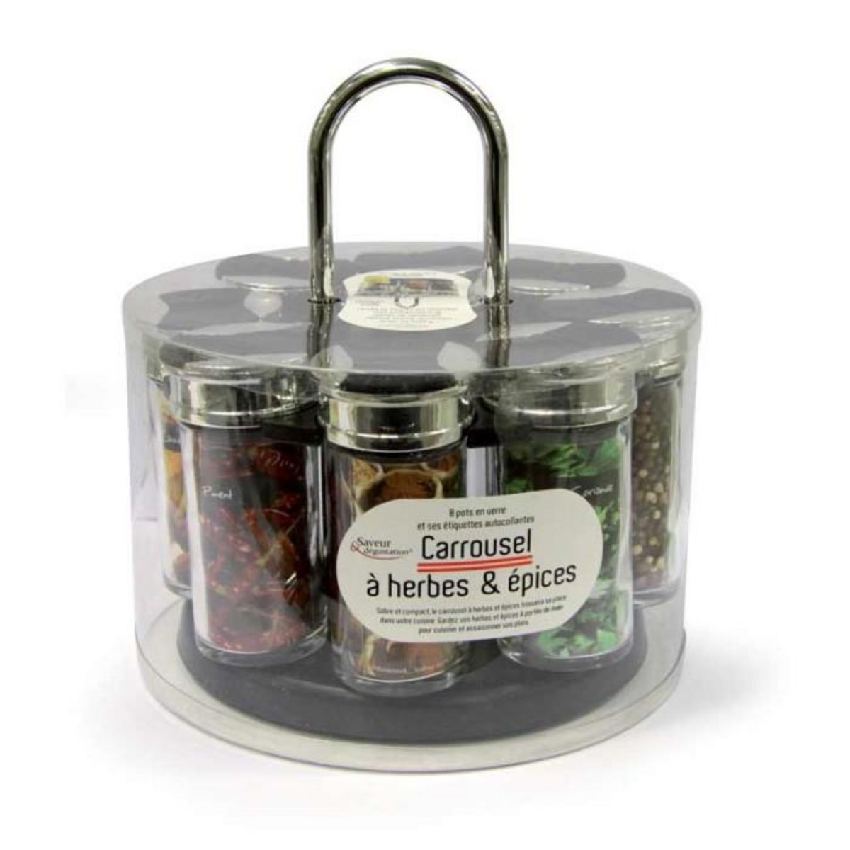 Informations Techniques : Dimensions : Carrousel : D. 19 x H. 12,5 cm Pot : D. 5 x H. 10 cm Matières : Verre & Plastique Spécificités : Carrousel tournant 8 Pots en Verre 16 Autocollants pour identifier les herbes et les épices Couleur : Noir