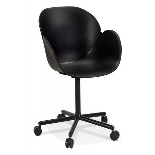Informations Techniques : Dimensions : L. 59 x l. 59 x H. 85 cm Assise : L. 53 x l. 45 x H. 44 cm Dossier : L. 50 x H. 40 cm Accoudoirs : H. 25 cm Sol-accoudoirs : H. 69 cm Matières : Revêtement : Polypropylène Piètement : Métal Spécificités : Élégante & Tendance Chaise de bureau à roulettes Avec a