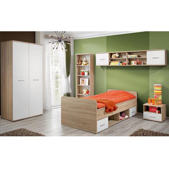 Informations Techniques : Dimensions : Lit : L. 204 x P. 96 x H. 64 cm Armoire : L. 90 x P. 55 x H. 191 cm Bibliothèque : L. 59 x P. 25 x H. 175 cm Table de Chevet : L. 45 x P. 40 x H. 38 cm Étagère Murale : L. 204 x P. 25 x H. 39 cm Matières : Structure : Panneaux de particules stratifiés Façades :