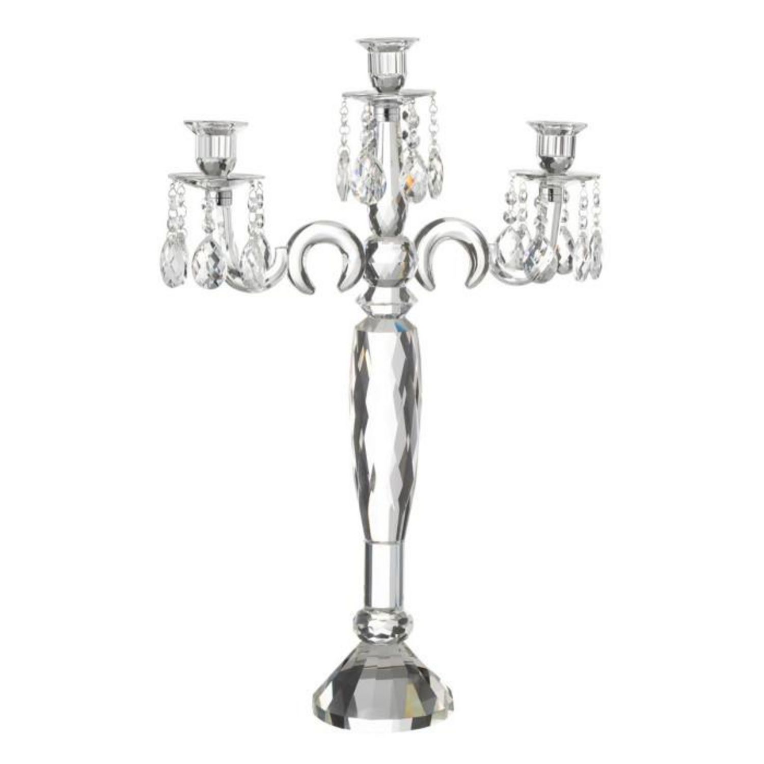 Informations Techniques : Dimensions : L. 42,5 x l. 12 x H. 65,5 cm Matière : 100% Cristal Spécificités : Élégant & Déco Chandelier 3 branches Design effet diamant Bougies non incluses Poids : 3,89 kg Couleur : Transparent