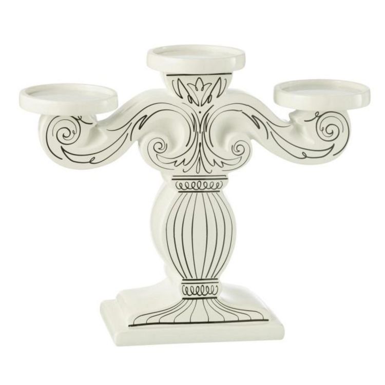 Informations Techniques : Dimensions : L. 33 x l. 10,5 x H. 26,5 cm Matières : 55% Chaux (Poudre) & 45% Résine Spécificités : Moderne & Déco Chandelier 3 branches Design bicolore Bougies non incluses Poids : 1,52 kg Couleur : Blanc & Noir