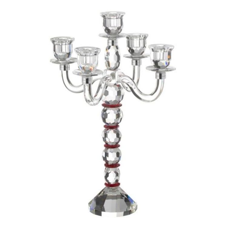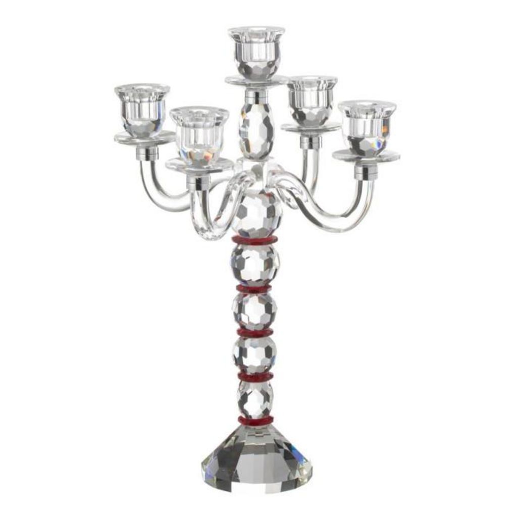 Informations Techniques : Dimensions : D. 32,5 x H. 49 cm Matière : 100% Cristal Spécificités : Élégant & Déco Chandelier 5 branches Design effet diamant Bougies non incluses Poids : 4,1 kg Couleur : Transparent & Rouge