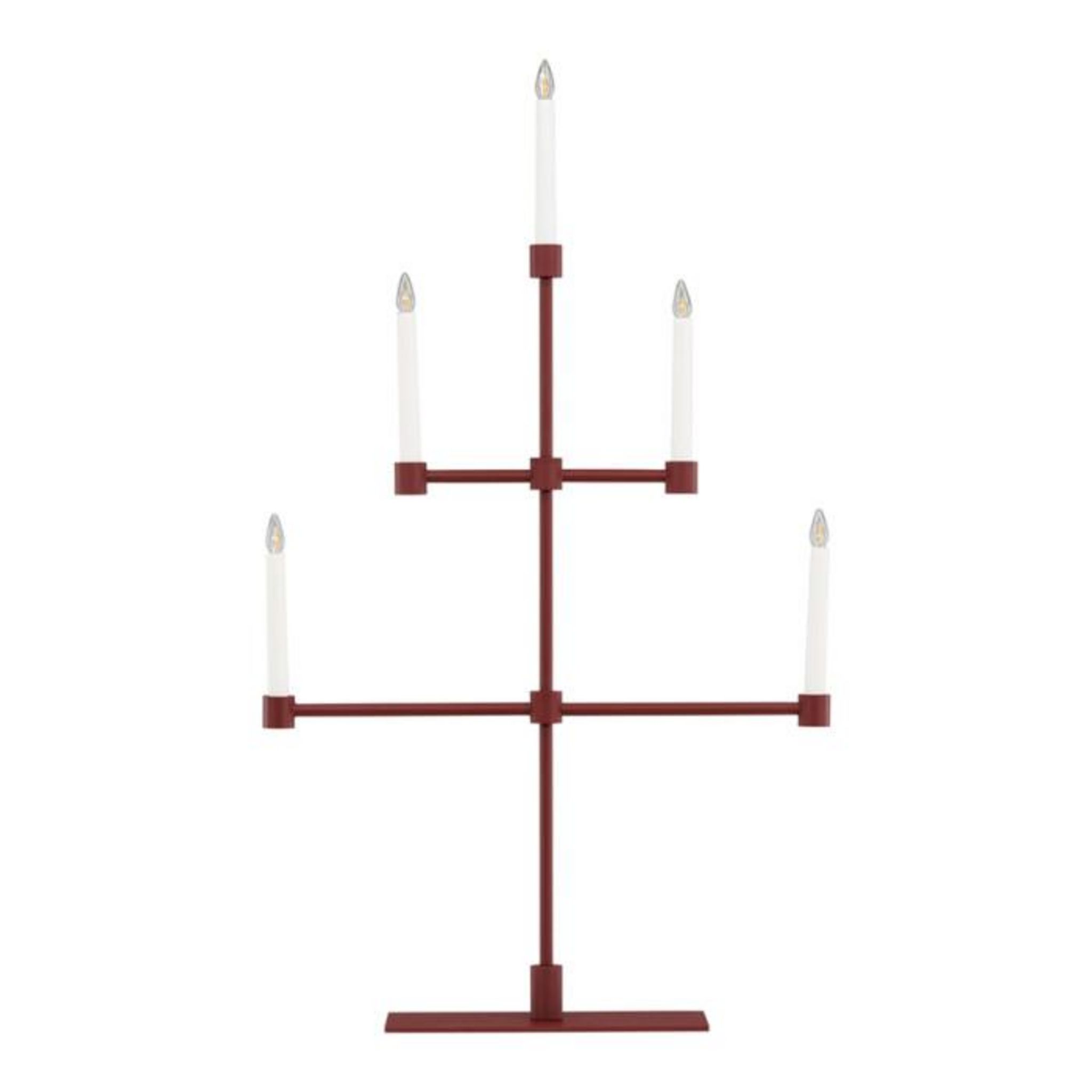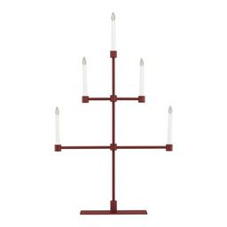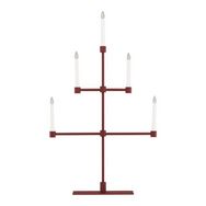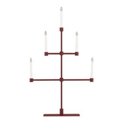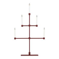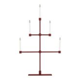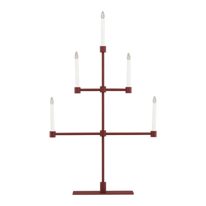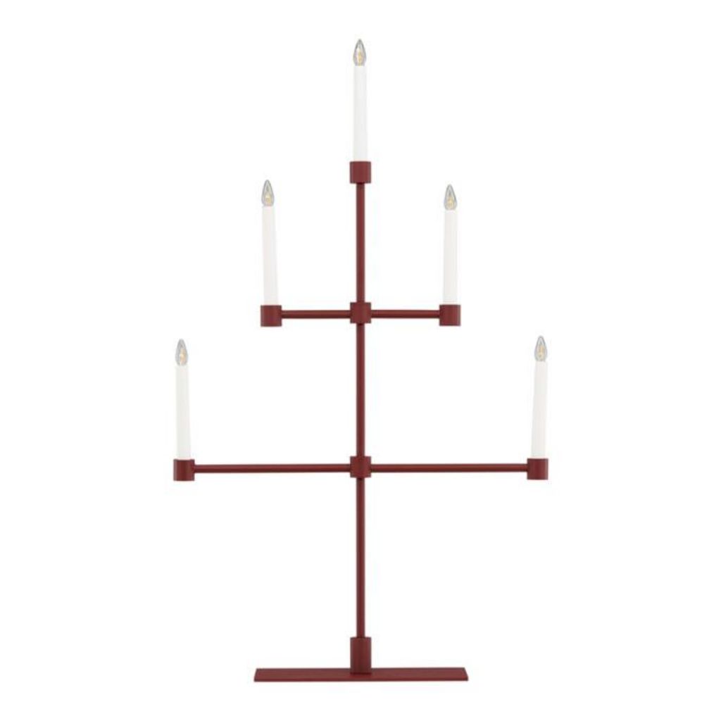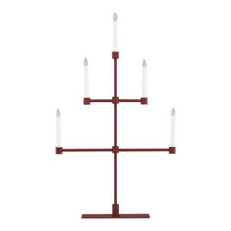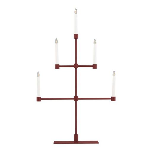 Informations Techniques : Dimensions : L. 53 x l. 12 x H. 92 cm Matières : Métal & PVC Spécificités : Design & Original Chandelier design Avec 5 bougies LED Interrupteur on/off Diffuse une lumière chaleureuse Type de culot : E10 Puissance : 0,5W Poids : 2,97 kg Couleur : Rouge