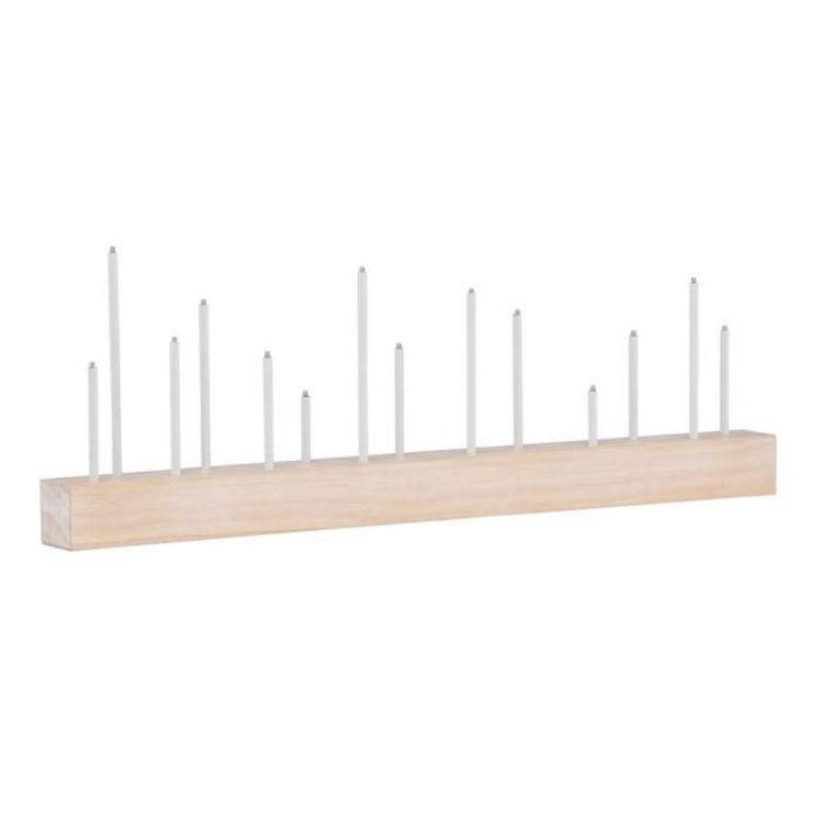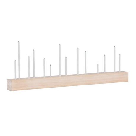 Informations Techniques : Dimensions : L. 77 x l. 6 x H. 24 cm Matières : MDF & PVC Spécificités : Design & Original Chandelier design Avec 14 bougies LED Diffuse une lumière chaleureuse Douille : E5 Puissance : 7,2W Poids : 1,54 kg Couleur : Naturel