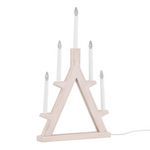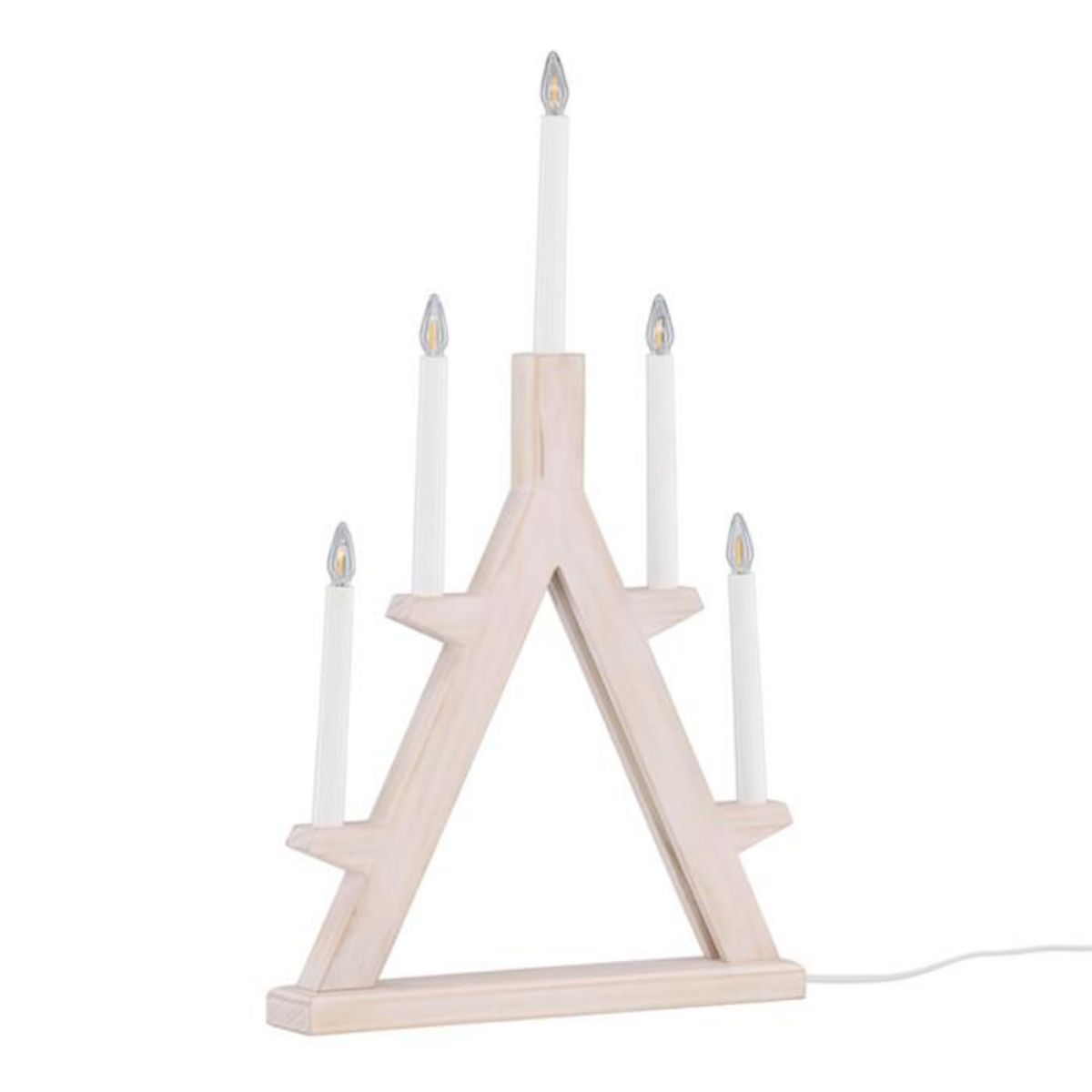 Informations Techniques : Dimensions : L. 60 x l. 6 x H. 36 cm Matière : Bois (Pin) Spécificités : Design & Original Chandelier design Avec 5 bougies LED Forme triangulaire Douille : E10 Puissance : 0,5W Poids : 0,85 kg Couleur : Nature
