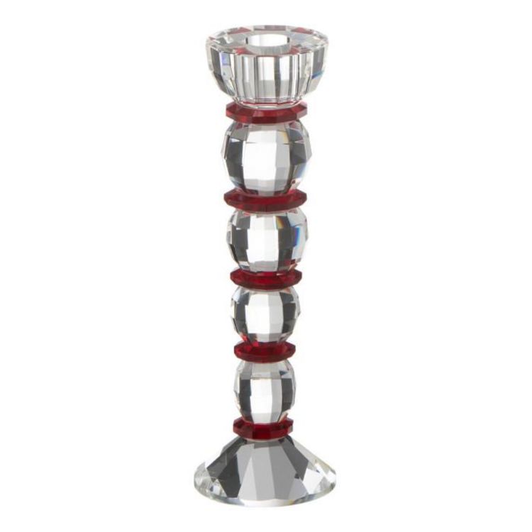 Informations Techniques : Dimensions : D. 7 x H. 22,5 cm Matière : 100% Cristal Spécificités : Élégant & Déco Chandelier bicolore Design effet diamant Bougie non incluse Vendu à l'unité Poids : 0,54 kg Couleur : Transparent & Rouge