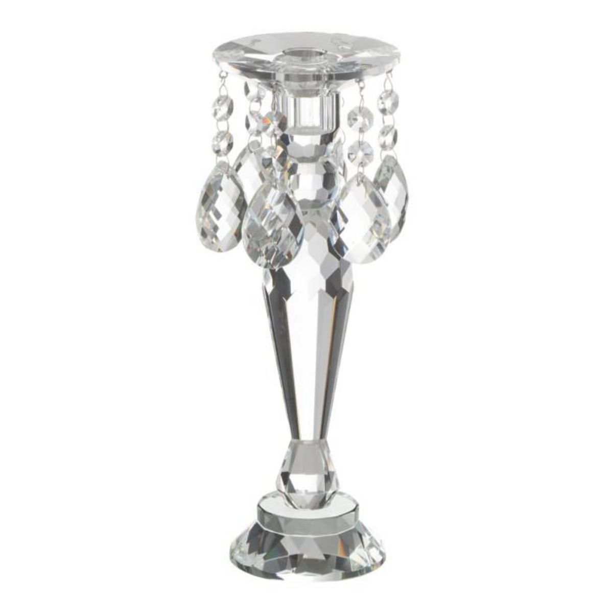 Informations Techniques : Dimensions : D. 10 x H. 28 cm Matière : 100% Cristal Spécificités : Déco & Élégant Chandelier design diamant Bougie non incluse Vendu à l'unité Poids : 0,89 kg Couleur : Transparent