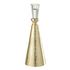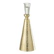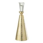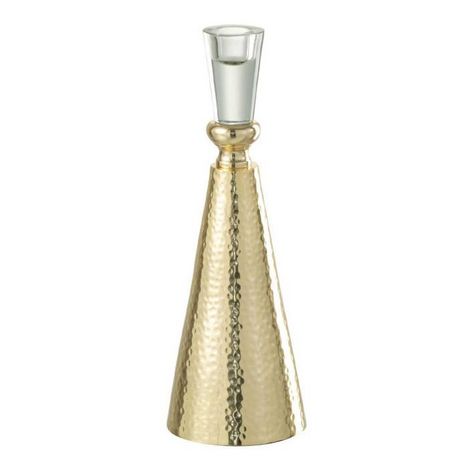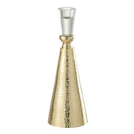 Informations Techniques : Dimensions : D. 8,3 x H. 25 cm Matières : 73% Aluminium & 27% Verre Spécificités : Chic & Déco Design martelé Forme conique Bougie non incluse Vendu à l'unité Poids : 0,53 kg Couleur : Or & Transparent