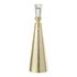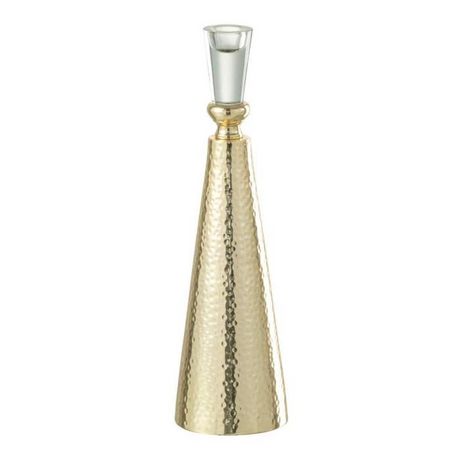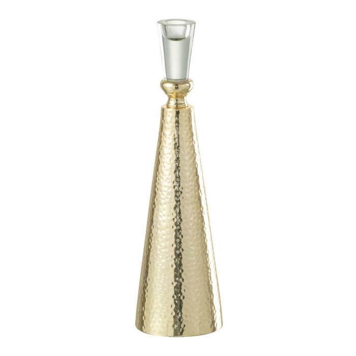Informations Techniques : Dimensions : D. 8,3 x H. 32 cm Matières : 73% Aluminium & 27% Verre Spécificités : Chic & Déco Design martelé Forme conique Bougie non incluse Vendu à l'unité Poids : 0,9 kg Couleur : Or & Transparent