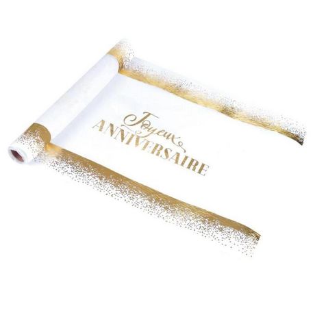 Informations Techniques : Dimensions : L. 5 m x l. 28 cm Matière : Polyester Spécificités : Pratique & Tendance Chemin de Table Déco Jetable Impression Joyeux Anniversaire Forme Rectangulaire Couleur : Blanc & Or