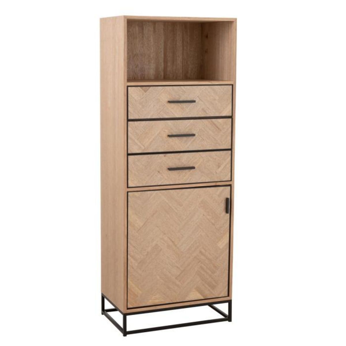 Informations Techniques : Dimensions : L. 60 x l. 38 x H. 158 cm Matière : Bois & Métal Spécificités : Pratique & Tendance Chiffonnier Design 3 Tiroirs 1 Porte 1 Niche Poids : 45 kg Couleur : Naturel & Noir