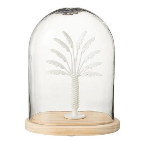 Informations Techniques : Dimensions : L. 22 x l. 16 x H. 28 cm Matières : 60% Verre, 20% Zinc & 20% Bois (Pin) Spécificités : Déco & Élégante Cloche ovale Avec palmier Vendue à l'unité Poids : 1,47 kg Couleur : Blanc & Naturel