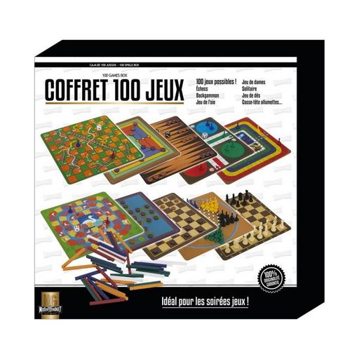 Informations Techniques : Dimensions : L. 8 x l. 28 x H. 7 cm Matière : Papier Spécificités : Pratique & Utile Coffret 100 Jeux de Société Echecs, Backgammon, Jeu de l'Oie, Jeu de Dames, Solidaire, Jeu de Dés, Casse-Tête Allumettes... Poids : 1 kg Couleur : Multicolore